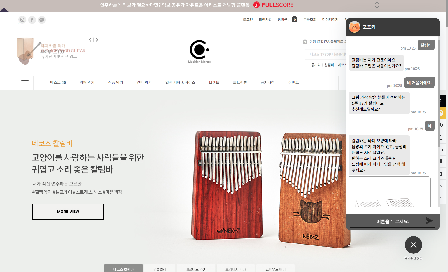 칼림바 뭘 사야 할지 고민만 하시는 분들! 어서 뮤지션마켓 웹사이트에 대기 중인 포포키와 상담해보세요~