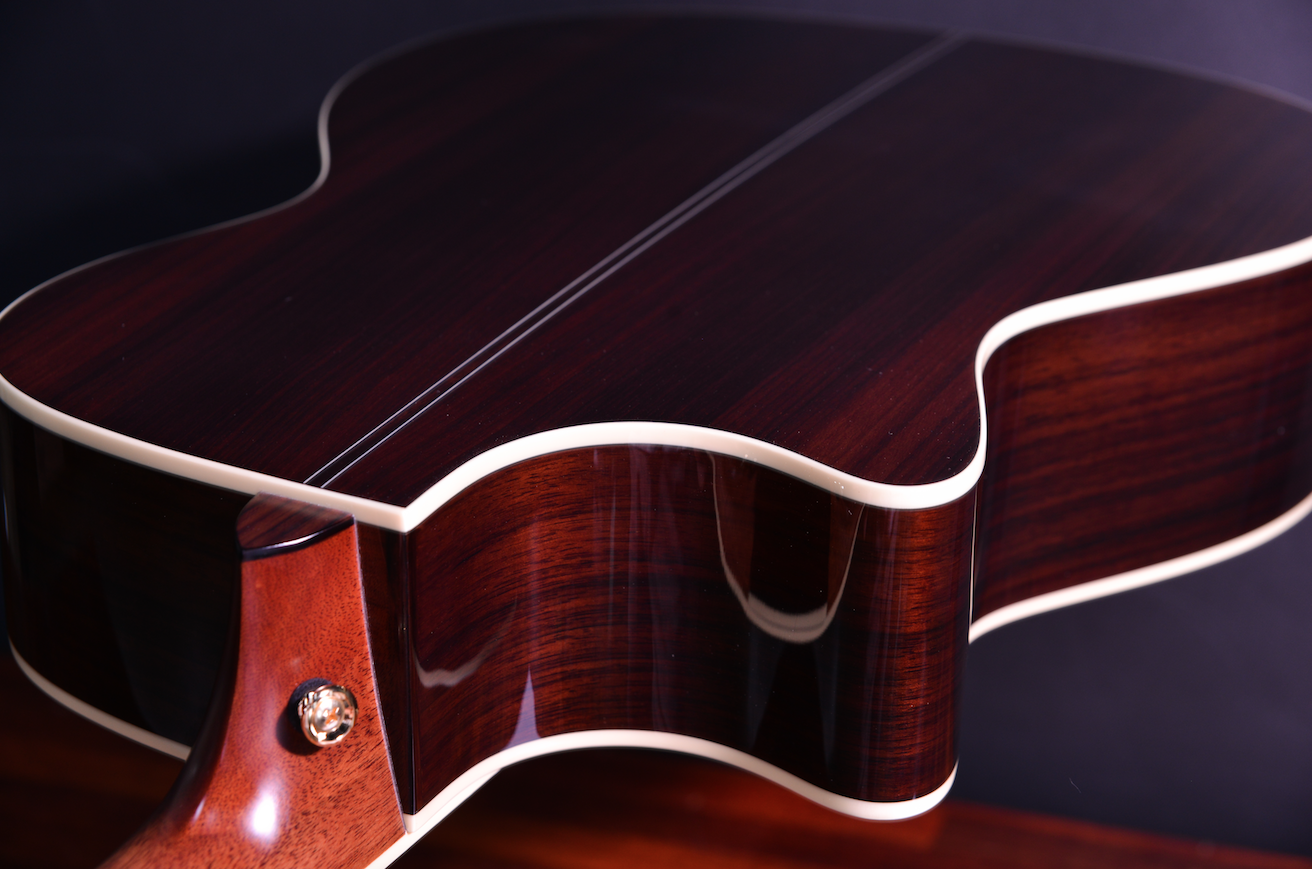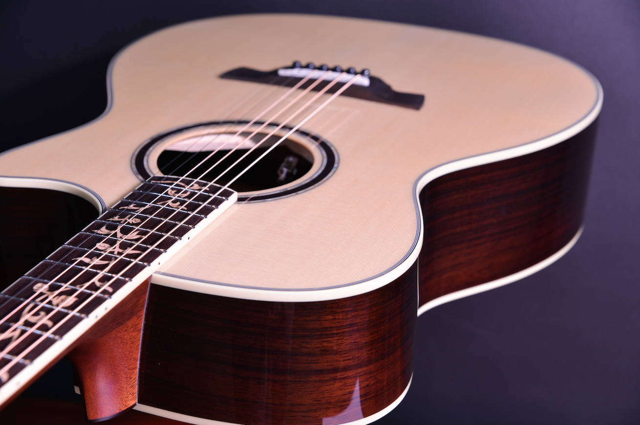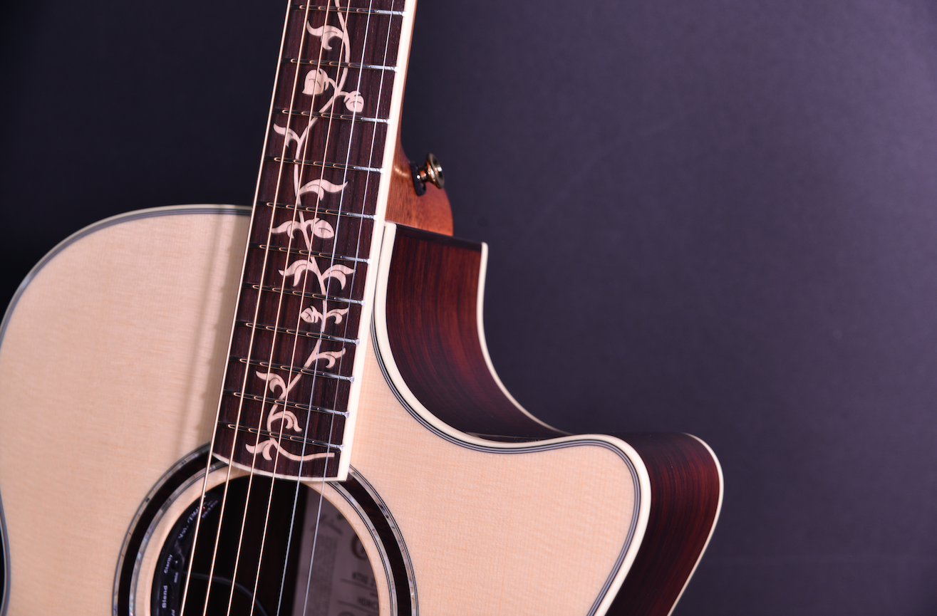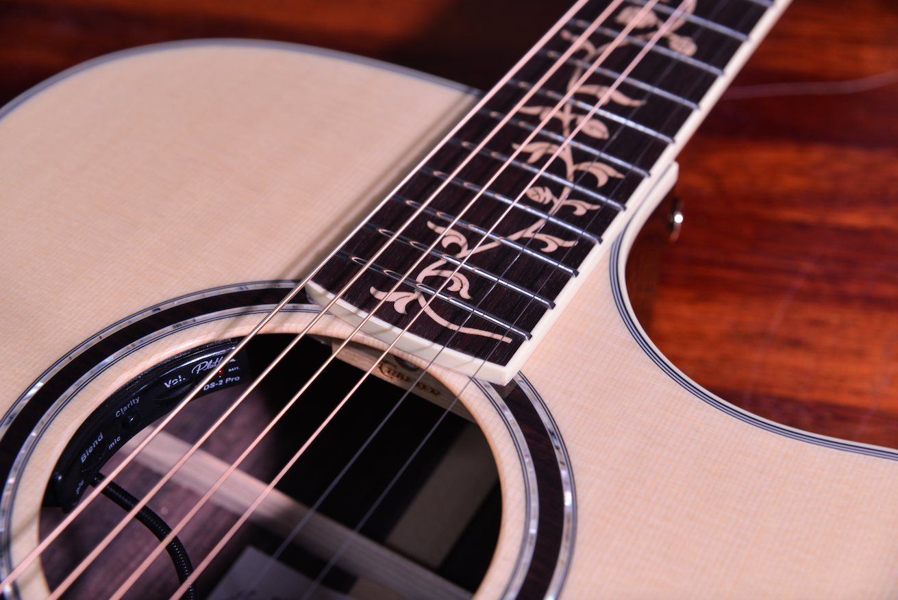 사운드홀 로젯부터 바인딩, 지판 인레이, 헤드머신 등 뭐 하나 빠지지 않고 최고급 스펙이 적용된 모자람 없는 기타에요.