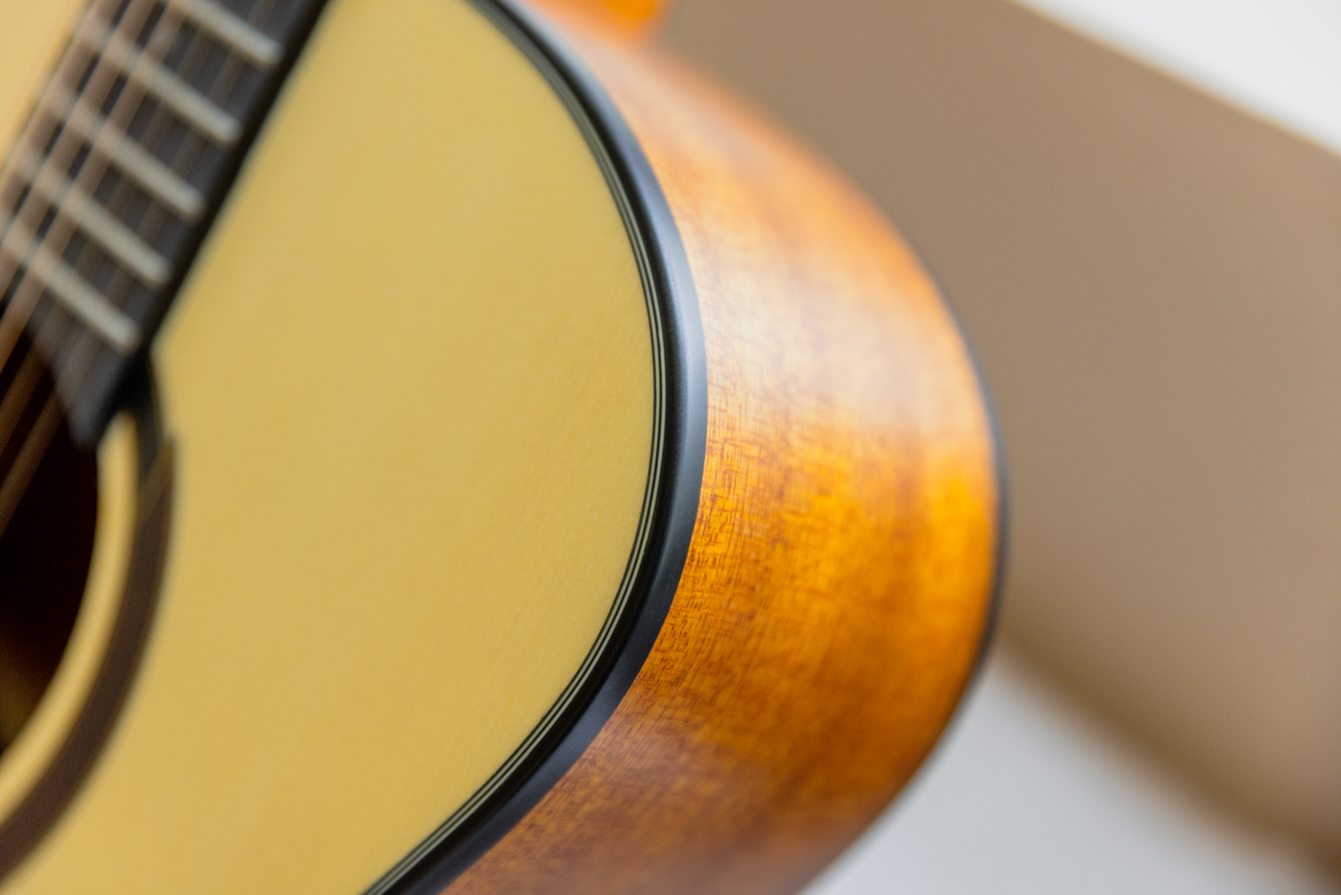 고퍼우드 G110 통기타는 기타 상판과 측후판의 모서리 부분을 라운딩 형태로 마감해서 연주하는 오른 팔이 기타 모서리에 닿아도